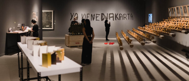 Image 2: Works of Ho Tzu Nyen, Belkis Ayon Manso, Dolorosa Sinaga, Etcétera, Sarah Ortmeyer, and S. Teddy D, in Para Sekutu yang Tidak Bisa Berkata Tidak (literally the Acquiescent Allies), 2022. Photo by Sancoyo Purnomo. Courtesy of Goethe-Institut Indonesien / Grace Samboh.