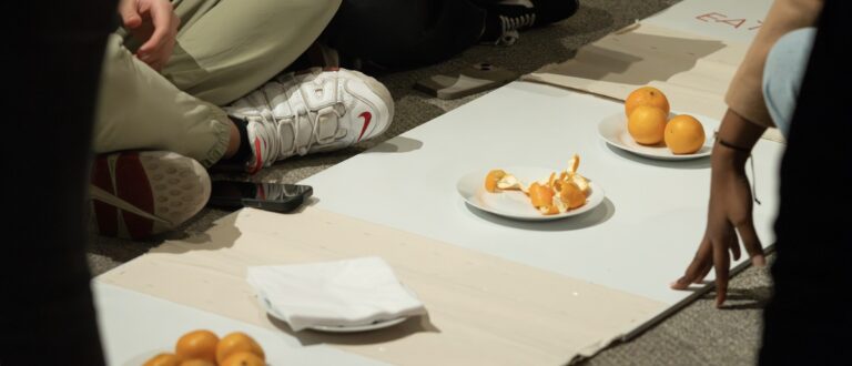 In collaboration with Febrik, the group have worked with a variety of tools and references to think through their individual as well as collective interests and motivations. Through these creative sessions, themes of care and protection emerged as interpretations of solidarity. The project interrogated meanings of ‘sitting’ as a social and political practice and proposed settings of care with the body and elements from the studio space – such as chairs, walls and doors. The sessions asked questions about proximity, power dynamics, violence, fragility and support.
