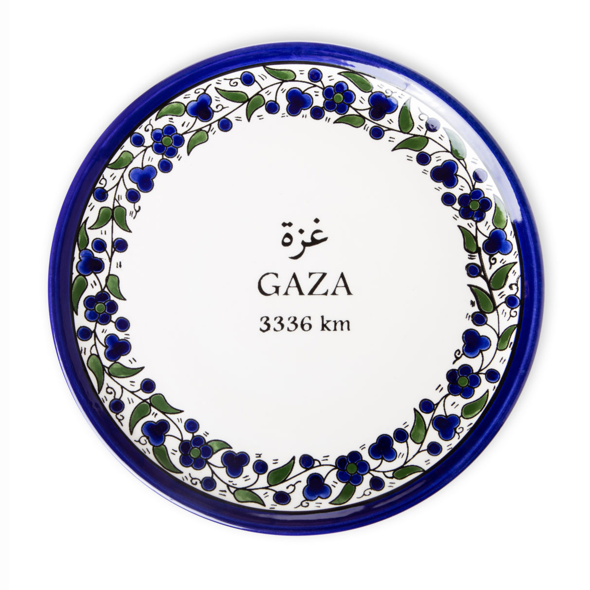 “Distance to Gaza” is an homage to artist Khaled Hourani’s art project “The Road to Jerusalem”, where he placed ceramic tiles featuring the distance from different locations to Jerusalem. Together with the International Academy of Art-Palestine, we developed ceramic plates depicting distance markers to Gaza. The plates connect different locations in the world to Gaza, whose borders are locked because of the Israeli siege since 2007. Nevertheless, Gaza remains a pulsating centre for Palestine.