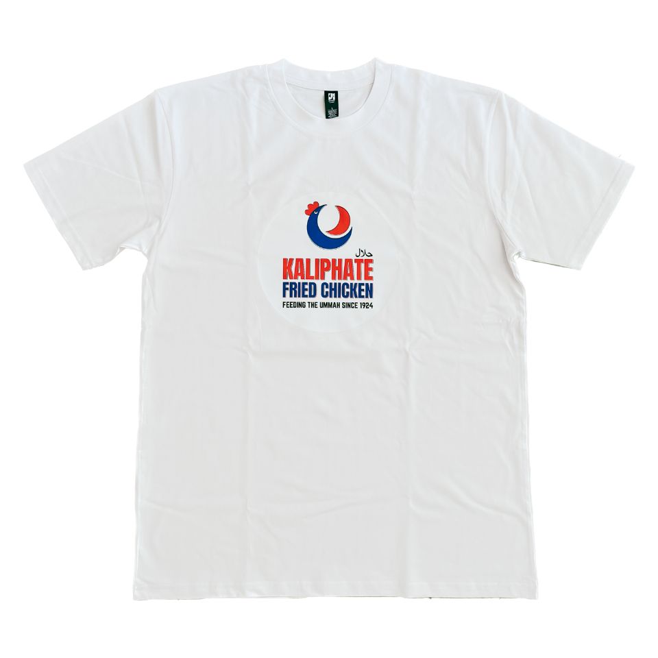 This T-Shirt is part of Ahsan’s project for Documenta 15, where signs of fictional fried chicken chains were exhibited around the city of Kassel for the duration of 100 days with satirical references to the Ottomans (Kaliphate Fried Chicken), Moorish Spain, Muslim sports icon and postcolonial thinkers (Fanon Fried Chicken) both inside and outside the exhibition venues.