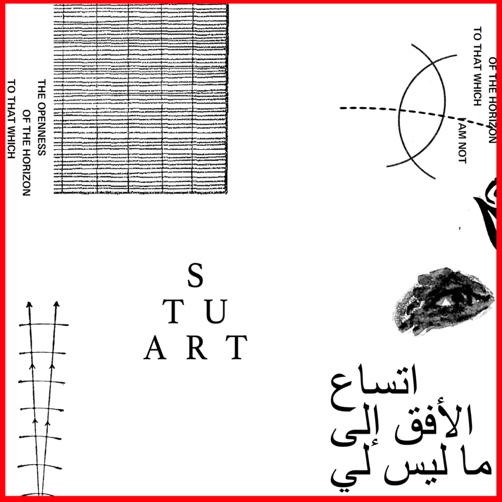 STUART Paper Issue 2: The Openness of the horizon to which I am not features contributions by: Al Wahat Collective (Areej Ashhab, Gabriella Demczuk, Ailo Ribas), Dina Mimi, Disarming Design, Elias Wakeem, Fana’ Collective, Karmel Sabri, Hajra Waheed, Islam Shabana, Ismail Nashef, Jumana Emil Abboud, KURS (Miloš Miletić and Mirjana Radovanović), Mohammad Sabaneh, Mo’min Swaitat / Majazz, Mothanna Hussein, Nika Autor, Qusai al Saify, Radio AlHara, RESOLVE Collective, Rouzbeh Shadpey, Shayma Nader, Tai Shani, The School of Mutants (Hamedine Kane and Stéphane Verlet-Bottéro), and Xaytun Ennasr.